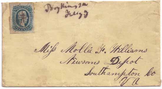 VA3085 | CSA #11 (AD) (4-Margin) Pen-Cancelled and the "Boykins (Southampton County), Va Febry 3" manuscript postal markings to the right. Addressed to Miss Mollie F. Williams, Newsoms Depot, Southampton Co., Va. Very Fine. | $125.00 |