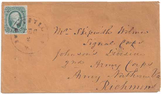 CSA #12c (AD) Greenish-Blue (margin touches at the left) tied by the Scottsville, Va CDS 2 DEC. Full Military Address to Mr. Skipwith Wilmer, Signal Corps, Johnson's Division, 2nd Army Corps, Army Northern Va, Richmond (Va). Part of top back flap missing, otherwise a very clean cover.