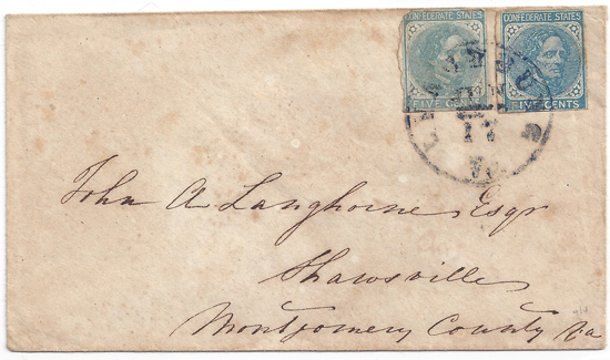 CSA #7 two singles (margins tight) tied together and to the cover by an escellent strike of the VIOLET Lynchburg, Va CDS 17 JUN (1863). Addressed to John A. Langhorne, Shawsville, Montgomery County, Va. Very clean cover.