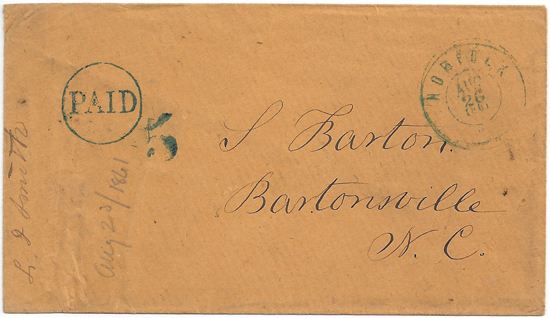 | VA3153 | Stampless Paid cover with the small double circle Norfolk, Va CDS with handstamp PAID 5 Type D all in BLUE 26 AUG 1861. Addressed to S. Barton, Bartonsville NC. Orange paper cover with a top back flap opening tear, otherwise Very Fine. | $175.00 |
