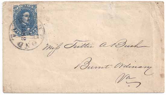 | VA3178 | CSA #4a Dark Blue Stone 2 Position 6 (margin just in at the right and with a random inked printing flaw in the "S" of "POSTAGE") tied by the Richmond, Va (1862 date not fully apparent). Addressed to Miss Trittie A. Bush, Burnt Ordinary, Va. Back flap opening tears, otherwise a very clean cover. | $175.00 |