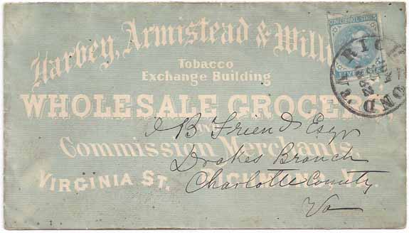 | VA3184 | CSA #6 Single Use Prior to the Rate Change (just barely touches left at top) tied by the Richmond, Va CDS Powell Type 3b (broken “N” of “JUN”) 23 JUN 1862. Overall Green Advertising Cover for Harvey, Armistead & Williams Tobacco Exchange Building Wholesale Grocers and Commission Merchants Virginia St, Richmond, Va. Addressed to B. Friend Esqr, Drakes Branch, Charlotte County, Va. Very Fine. | $750.00 |