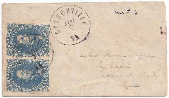 VA3196 | CSA #4 Horz Pair Stone 2 Positions 27-28 (4-Margin) tied by the small single rim Churchville, Va CDS 2 AUG (1862) with a second strike of the same CDS to the right which also ties the stamps. Small but complete lady's type cover addressed to Miss Fannie Snyder, Ivy Depot, Albemarle County, Virginia. The address is a bit light but still very legible. The cover is otherwise Very Fine. | $400.00 |