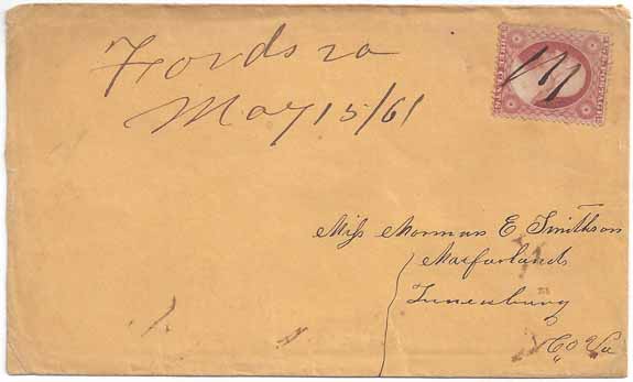 VA3198 | USA #26 affixed sideways and prn-cancelled. Manuscript postal marklings top left "Fords (Depot) Va May15 / 61" USA Used in CSA Virginia. Addressed to Miss Norman E, Smithson, Macfarlands, Lunenberg Co., Va. Ford's Depot was a stop on the South Side Railroad in Dinwiddie County. Very clean cover and quite an obscure postal use. Ex-Thayer. | $350.00 |