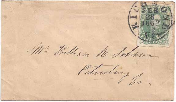 VA3243 | CSA #1 Stone 1 Position 46 (4-Margin) tied by a bold strike of the Richmond, Va CDS Powell Type 3a 28 FEB 1862. Addressed to Mr. William E. Johnson, Petersburg, Va. Very clean appearing cover. | $225.00 |