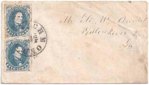 | VA3245 | CSA #4 Vert Pair Stone 2 Positions 20, 30 (4-Margin with just a little edge gum toning) tied by the Richmond, Va CDS 22 JUN (1862) Powell Type 3b (broken "N' of "JUN"). Addressed to Mr. Eli McDaniel, Yellow River PO, Ga. Most likely sent by a Georgia soldier home to a relative but am not able to identify the sender. Very clean appearing cover with only a little light staining. | $225.00 |