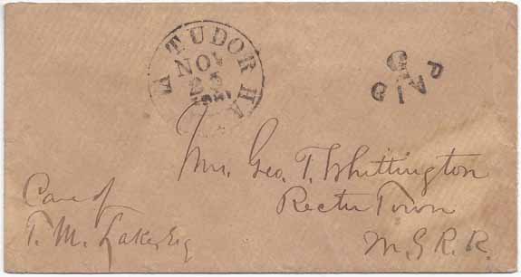 Stampless PAID cover with the Tudor Hall, Va CDS and handstamp PAID 5 Type B 25 NOV 1861. Light coarse brown paper cover with railroad address to Mr. Geo T. Whittington Care of T. M. Lake Esq, Rectortown (Station) M. G. R. R. (Manassas Gap Railroad)
