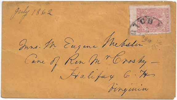 Care of Rev Mr Crosby, Halifax C. H., Virginia. Back flap opening tear.
