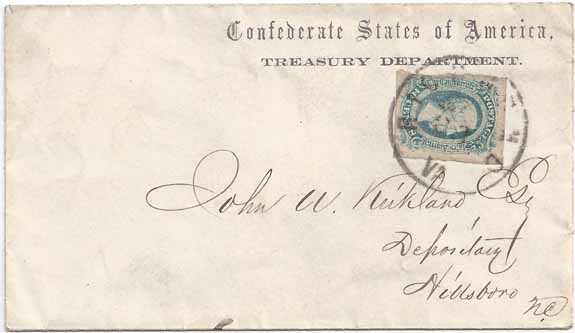 | VA3260 | CSA #11 (AD) (margin just a little irregular at the left) tied by the Richmond, Va CDS (date not fully apparent). Commercial envelope Semi-Official Imprint "Confederate States of America Treasury Department" (CC TD-01). Addressed to John W. Kirkland Esq, Depository, Hillsboro NC. Minor back flap opening tear, otherwise Very Fine. | $300.00 |
