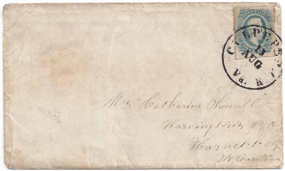 CSA #11a (AD) Milky Blue (4-Margin) tied by a bold strike of the Culpeper CH, Va CDS 11 AUG. Addressed to Mrs. Catherine Small, Harrington PO, Harnett Cty, N. Carolina. Very clean cover.