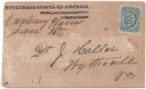 CSA #12 (AD) (margin close on the right) pen-cancelled and manuscript "Cranberry Plains (Va) Jan 15" at the left. Very obscure use from Carroll County. Addressed to Dr. J. Haller, Wytheville, Va. Semi-Official imprinted cover "Confederate States of America, Nitre and Mining Service. Official Business." (CC WD-NM-14).