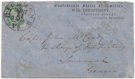 CSA #12c (AD) Dark Greenish-Blue ( margin just in at the left) tied by a full strike of the Richmond, Va CDS Powell Type 5d 11 AUG 1863. Blue paper cover “Confederate States of America, War Department, Engineer Bureau. Official Business.” Semi-Official Imprint (CC WD-EN-03). Military Address to Capt John McCrady In charge of Fortifications, Savannah, Georgia. Very minor edge faults at top which do not detract from a very fine appearance.