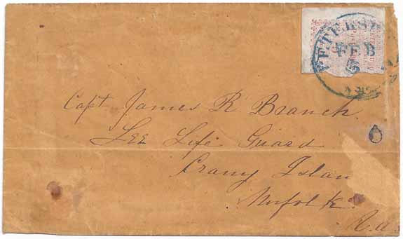 CSA #65x1 Petersburg, Va 5c Red Provisional Position 6 affixed sideways (margin quite irregular at the right into the design but with left and bottom sheet margins) tied by the BLUE Petersburg, Va CDS 5 FEB (1862). Listed on the Calhoun Census of Petersburg Provisional covers. Military Address to Capt James R. Branch, Lee Life Guard, Crany Island, Norfolk Co., Va.
