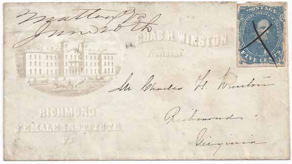 CSA #4 Stone 2 Postion 17 (4-Margin) pen-cancelled "X" and the manuscript postal markings to the left "Mattoax, Va June 20th". Mattoax was a stop on the Richmond and Danville Railroad in Amelia County. Richmond Female Institute overall illustrated College Advertising Cover in Light Grey.