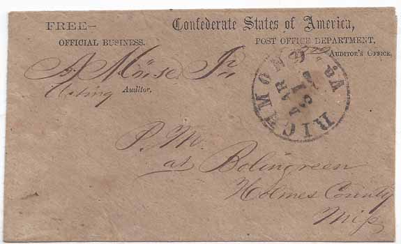 VA3327 | Stampless FREE cover with the Richmond, Va CDS Powell Type 5f 31 MAR (1864). POD Official Imprint "Post Office Department, Auditor's Office FREE - Official Business" signed by A. Moise Jr Acting Auditor. This Official Imprint is currently unlisted in the new CSA catalog. Addressed to PM at Bolingreen, Holmes County, Miss. Heavy coarse paper cover which appears to be homemade. Ex-Marcus White Collection Very Fine. | $500.00 |