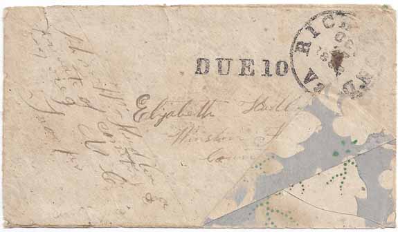Stampless Soldiers DUE cover with the Richmond, Va CDS Powell Type 3g (broken "O" of "OCT") and handstamp DUE 10 Type Q 27 OCT 1862. Endorsed at left “John W. Hudler, Private of Company D 57 reg NC Troops.” Addressed to Elizabeth Hudler, Winston, Forsyth County NC. Wallpaper Adversity Cover with a Gray, Green, and Cream leaf and floral design with the right lower corner flapped up for display. Very Fine.