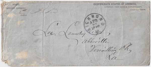 Stampless FREE cover with the Richmond, Va CDS Powell Type 6d 25 APR 1863. Legal size cover with Official