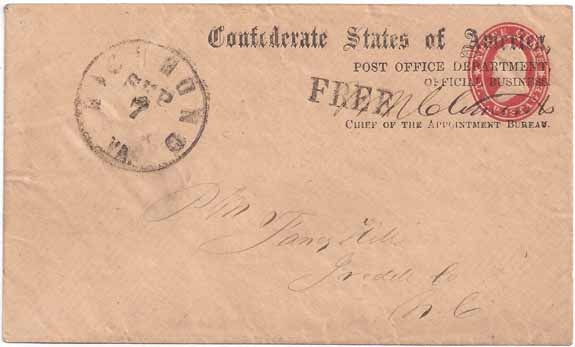 VA3348 | USA Star Die overprinted with Official POD Imprint "Confederate States of America, Post Office Department, Official Business signed by B. N. Clements Chief of the Appointment Bureau" Type APP-03. Richmond, Va CDS Powell Type 6m 7 SEP (1864) and handstamp FREE Type AA. Addressed to PM Fancy Hill, Iredell Co., NC. Address a little light but still very legible. Very Fine. | $400.00 |