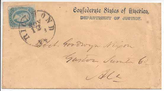 | VA3354 | CSA #11 (AD) (margin a little tight at the bottom) tied by the Richmond, Va CDS Powell Type 5d 12 NOV 1863. Semi-Official imprinted cover "Confederate States of America, DEPARTMENT OF JUSTICE" (CC JD-03). Department of Justice imprints are not commonly seen. Addressed to Dct Goodwyn Nixon, Gaston, Sumter Co., Ala. Very well done edge repair at the top right above and not involving the imprint. Back flap opening tears. Otherwise still a very attractive and clean appearing cover. | $500.00 |
