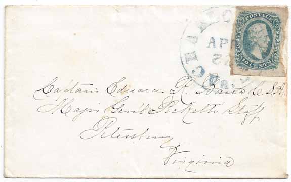 CSA #11 (AD) 4-Margin) tied by the BLUE Charlotte, Va CDS 22 APR (1864). The date numbers in the CDS are upside down. Military Address to Captain Edward R. Baird CSA, Major Genl Pickett's Staff, Petersburg, Virginia. Minor sealed back flap tear, otherwise Very Fine. Signed by Brian Green.