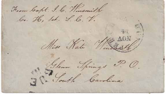 his mother, is extensive. His letters are archived at the Museum of the Confederacy (now known as the American Civil War Museum) in Richmond. This cover is addressed to his sister. |