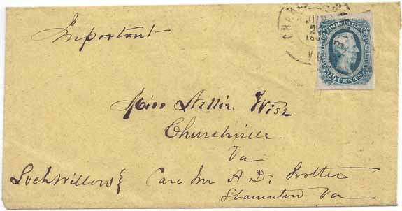 CSA #12 (AD) (4-Margin but a little close at the left) tied by the small double circle Charlottesville, Va CDS 24 JUN 1863. Addressed to Miss Nellie Wise, Churchville, Va , Care Mr A. D. Trotter, Staunton, Va. "Important" at top left. "Lochwillow"