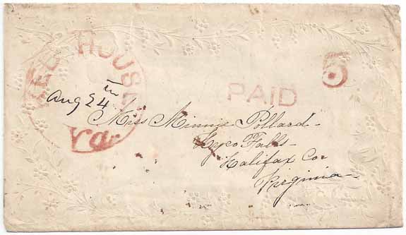Stampless PAID cover with the RED Red House, Va CDS with the date in manuscript Aug 24th (1861) and matching RED handstamp PAID 5