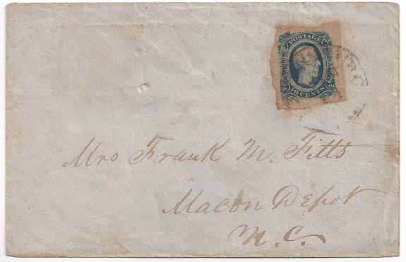 | VA3402 | CSA #12 (KB) (4-Margin) tied by a partial strike of the BLACK Petersburg, Va CDS 24 JAN (1865). Addressed to Mrs. Frank M. Fitts, Macon Depot NC. Period notation on the reverse written by the sender (the addressee's sister) which appears to be a postscript to the original letter. The original letter is no longer with the cover. Very clean cover. | $200.00 |