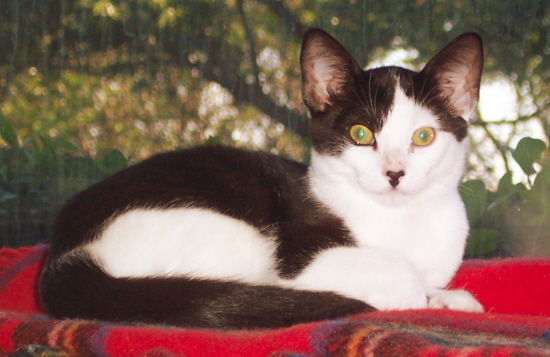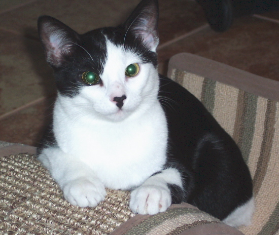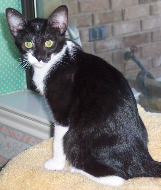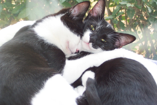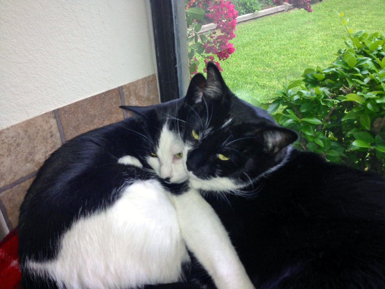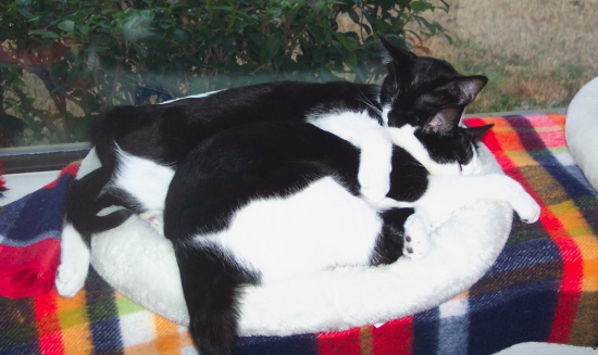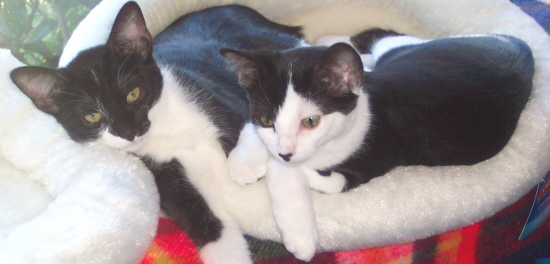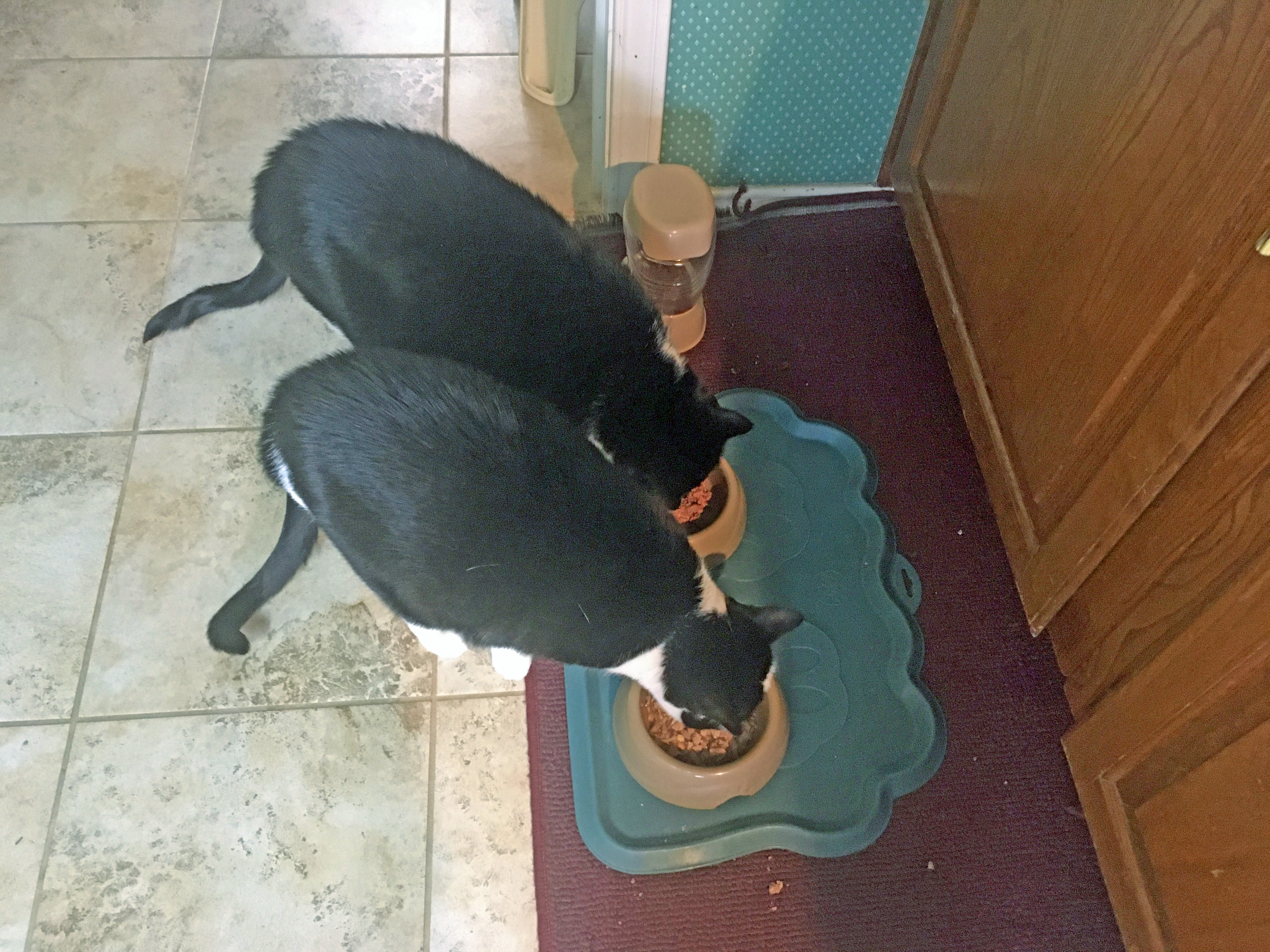 and Georgie III eating side-by-side at their usual place in the kitchen like they