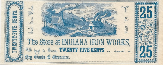 | CC1909 | 25c Fractional Note The Store at Indiana Iron Works (Pennsylvania) 1856. Farm Scene. Pre Civil War company store script used for buying Dry Goods & Groceries. Unsigned, Unissued, Uncirculated. |
