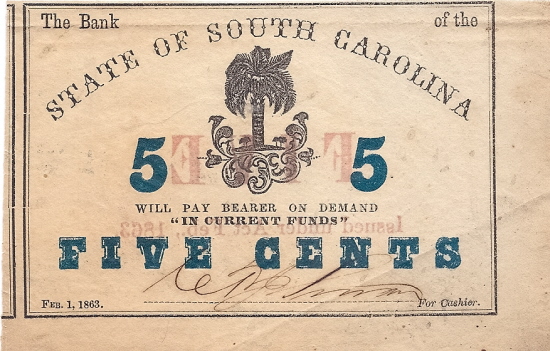 CC1984 | The Bank of the State of South Carolina 5c Fractional Note 1863. Palmetto Tree (central). The note shows part of the note at the left and wide sheet margins at right and bottom. The note was cut from the sheet and not circulated but does have some light folds and Grades XF. |