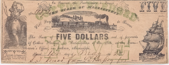 | CC2067 | $5.00 Note The State of Mississippi Cotton Pledged (green) 1st May 1862. Train (center), Indian (left), Sailing Ship (right) VF-XF. |