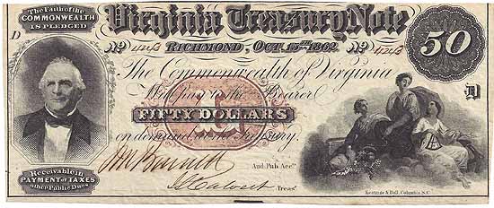 $50.00 Note Virginia Treasury Note (Cr-7) 1862. Governor Mason (left), Prosperity, Commerce, Navigation seated (right) AU. | $225.00 |