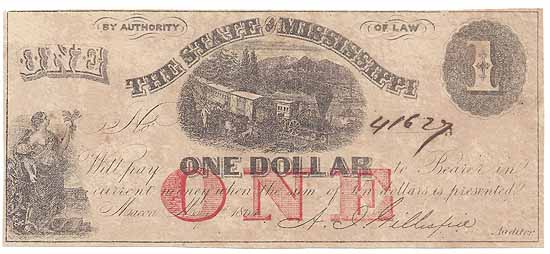 $1.00 Note The State of Mississippi 1864. Cr-44 Train (center), Standing Female Figure (Proserpina) (left) XF. |