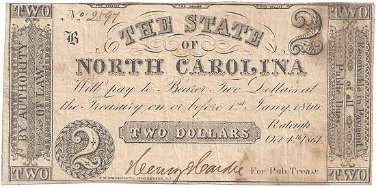 $2.00 Note The State of North Carolina (Cr-21) Oct 4th, 1861. Plain Paper, Plain Back, Light Staining F-VF. |
