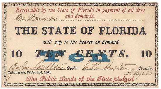 | CC2214 | State of Florida 10c Fractional Note (Cr-28) 1863 CU (Choice Uncirculated). |