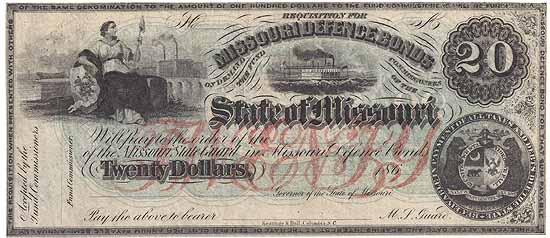 CC2244 | $20.00 Note Missouri Defense Bonds State of Missouri (Cr-21A) 186--. Plain Paper, No Watermark. River Steamboat (center), Seated Liberty (upper left), Missouri State Seal (lower right). Unsigned, Unissued, Uncirculated. |