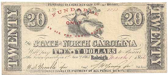 | CC2250 | $20.00 Note The State of North Carolina (Cr-78A) 1862. Floating Female Figure with Horn and Grain (Possibly Ceres) (center). "Fundable Only in Six Per Cent Bonds" Red Oval" XF. |