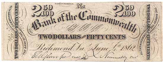 CC2269 | $2.50 Note Bank of the Commonwealth (Richmond) 1862. Watermarked Paper Uncirculated. |