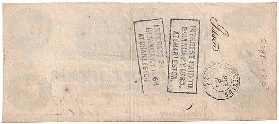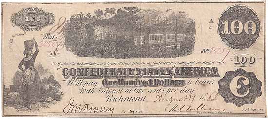 | T40 | CC2292 | CSA $100.00 Note (Train with Diffuse Steam and Milkmaid) Subtype Cr-298 Paterson August 19, 1862 date. No Watermark. Issued at Charleston with the small double circle Charleston SC postmark 8 SEP 1862 and Interest PAID at Charleston backstamps VF (usual small pinholes). |
