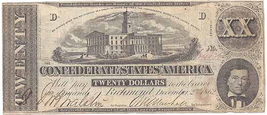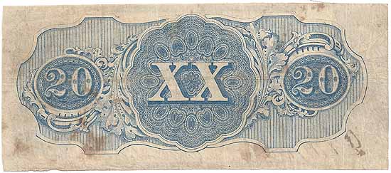 T51 | CC2299 | CSA $20.00 Note (Capitol at Nashville and Alexander H. Stephens) Subtype Cr-365 1st Series, shading, no printer's name Fine+ with some light toned spots. |