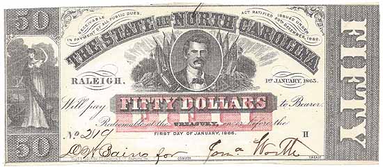 | CC2333 | $50.00 Note State of North Carolina (Cr-118) 1863. Governor Zebulon Vance with Battle Flags and Arms (center), Standing Justice with Scales (left), Watermark "J. Whatman 1861" (scarce watermark) XF. |