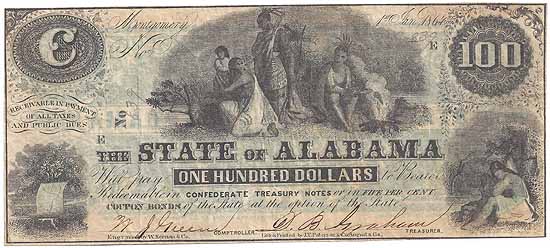 | CC2373 | $100.00 Note The State of Alabama (Cr-12) 1864. Group of Four Indians with Camp Fire (center), Alabama State Seal (lower left), Seated Indian Maiden (lower right) F-VF. |