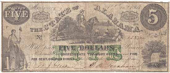 | CC2381 | $5.00 Note The State of Alabama (Cr-15) 1864. Overseer on Horseback with Slaves in the Wheatfield (center), Standing liberty with Shield and Liberty Cap (lower left), Alabama State Seal (lower right) Fine. |