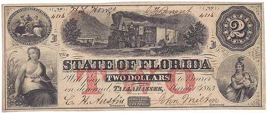 CC2383 | $2.00 Note State of Florida (Cr-18) 1863. Train (central), Seal with Justice and Ceres (upper left), Bare-Breasted Ceres (lower left), Indian Maiden (lower right) VF-XF. |