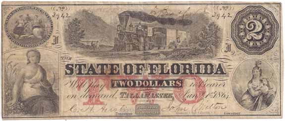 | CC2383A | $2.00 Note State of Florida (Cr-18) 1863. Train (central), Seal with Justice and Ceres (upper left), Bare-Breasted Ceres (lower left), Indian Maiden (lower right) Fine+. |