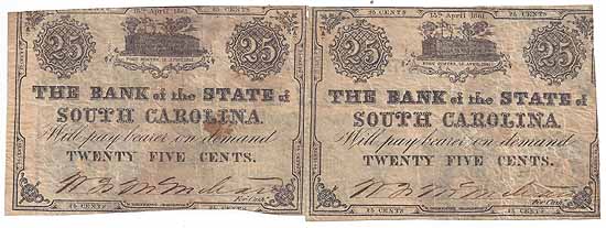 Minor period ink stain on the left note. The 25c South Carolina notes