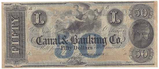 CC2409 | $50.00 Note Canal & Banking Co. (New Orleans). Female Figure with Eagle and Shield (center), Classical Bust (right), Anchor and Cornucopia and Chest (bottom center), Blue "50." Unsigned, Unissued, Uncirculated Remainder. |
