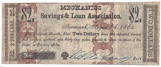 | CC2444 | $2.00 Note (Certificate of Deposit at 4% interest) Mechanics Savings & Loan Association (Savannah, Ga) August 6th, 1862. Printed on the back of obsolete currency of the Mechanics and Planters Bank Fine. |