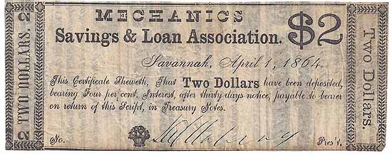 CC2445 | $2.00 Note (Certificate of Deposit at 4% interest) Mechanics Savings & Loan Association (Savannah, Ga) April 1, 1864. Printed on the back of Mechanics Savings & Loan Association obsolete 25c fractional notes Fine. |